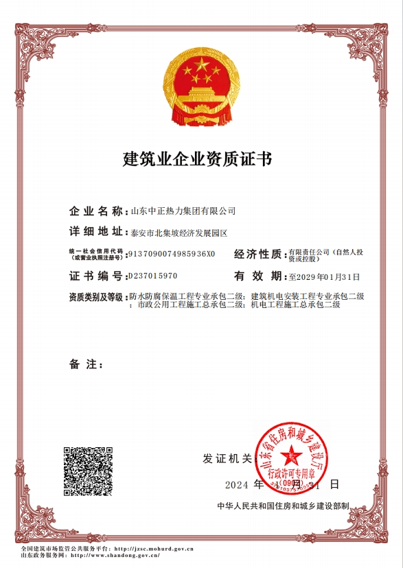 機電工程施工總承包二級、市政公用工程施工總承包二級、建筑機電安裝工程專業(yè)承包二級、防水防腐保溫工程專業(yè)承包二級